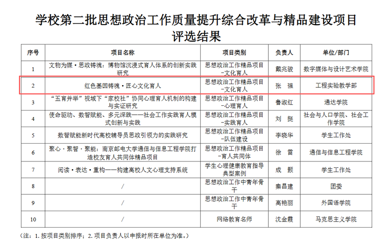 近日,学校公布了校第二批思想政治工作质量提升综合改革与精品建设项目评选结果,全校共有10项入选。其中,我部党总支选送的《红色基因铸魂·匠心文化育人》项目入选“文化育人类”项目,列总评排名第二。本次入选既是对学校为深入实施新时代立德树人工程,推动落实教育强国、教育强省建设重大改革任务,高质量推动“时代新人铸魂工程”,不断提高学校思想政治工作质量和水平,组织开展思想政治工作质量提升综合改革与精品建设的积极响应,也体现我部聚焦工程实验教育特色,突出实践育人成效,以高质量党建引领事业发展,推动“时代新人铸魂工程”取得的阶段性改革与建设成效。(撰稿:张戈 初审:张强 编辑:张戈 审核:张强)